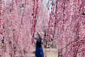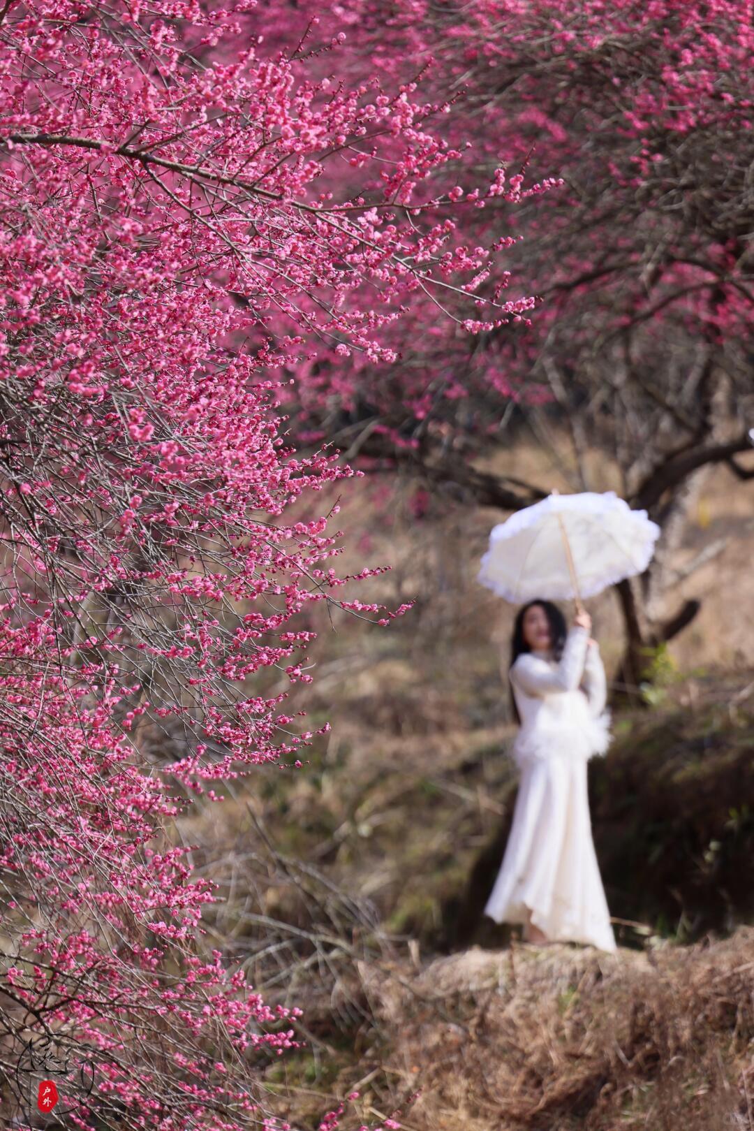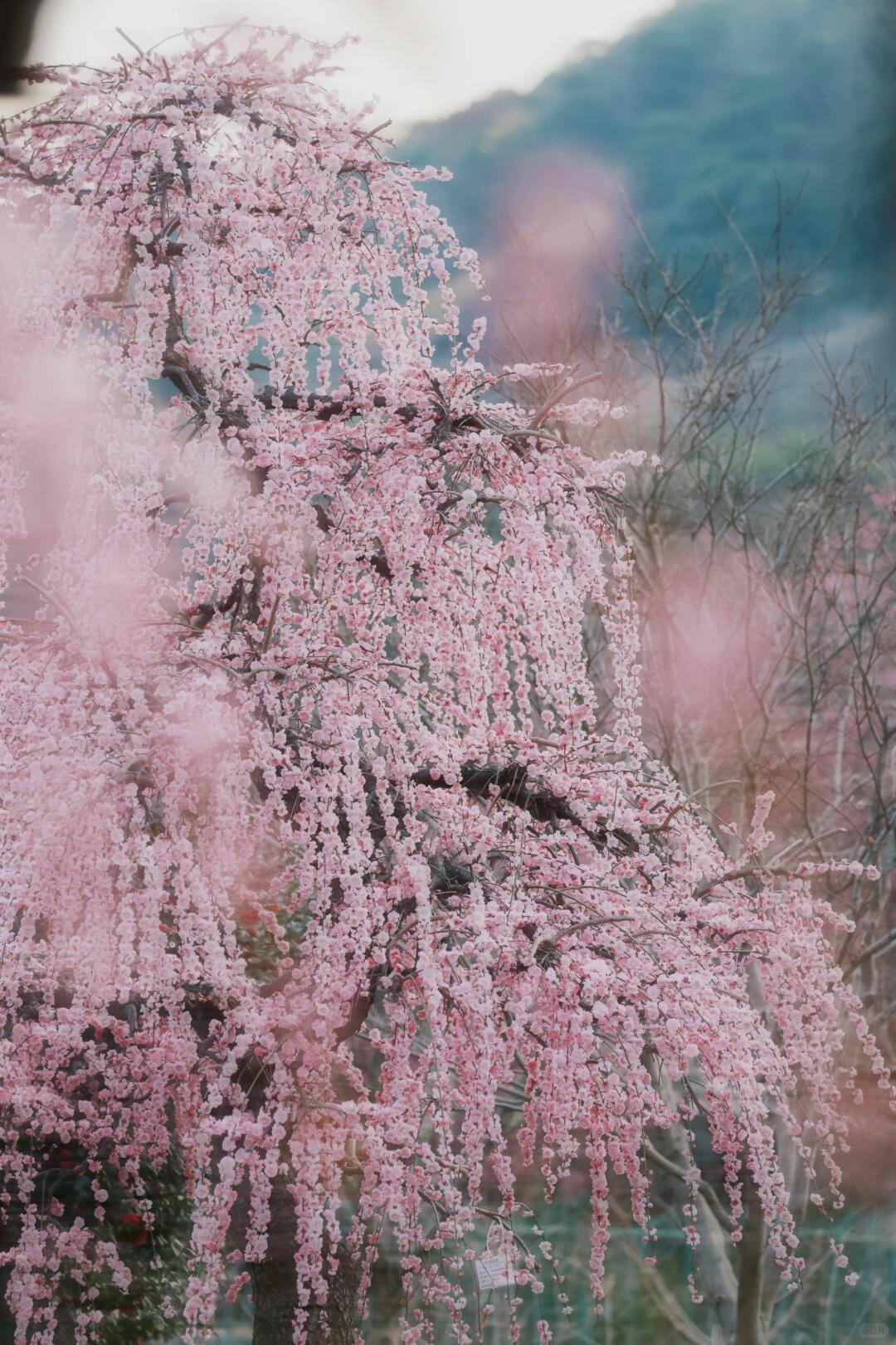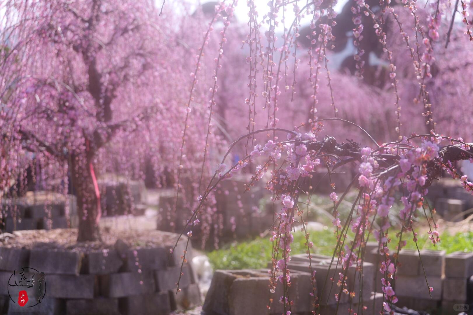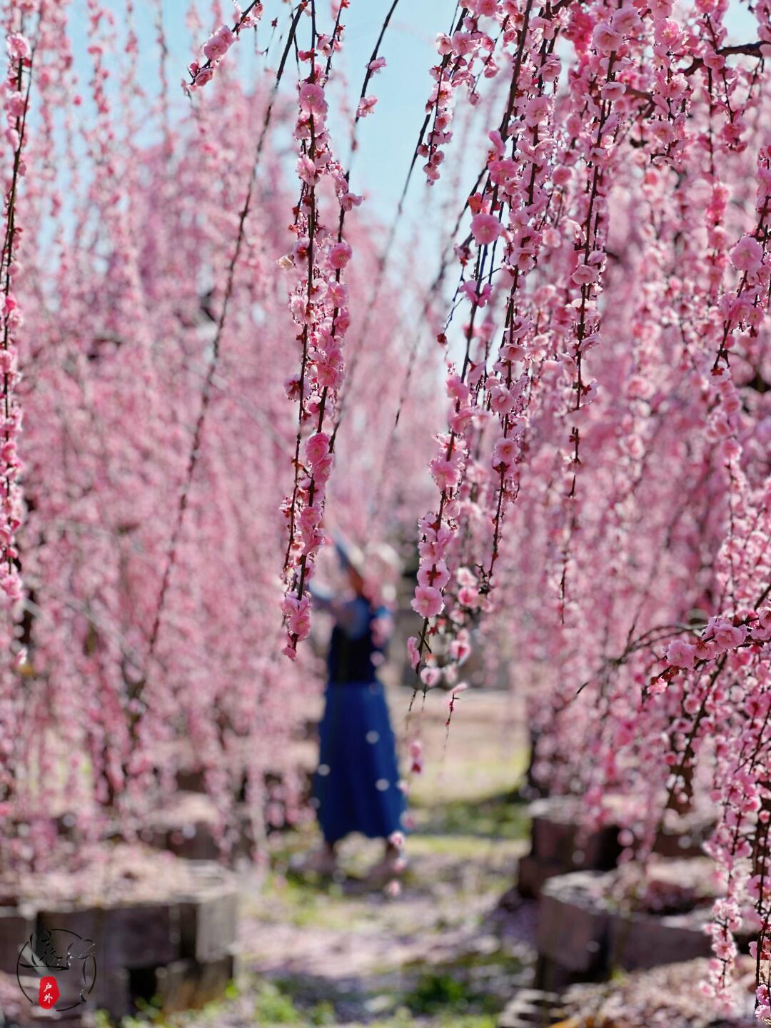 10:00 抵达【下周家村】,成片的垂丝龙梅像粉色瀑布倾泻而下,风一吹,花瓣簌簌落在肩头, 再透过龙梅粉色的枝枝蔓蔓拍人像,古人说的美人分花拂柳的氛围感不就有了~