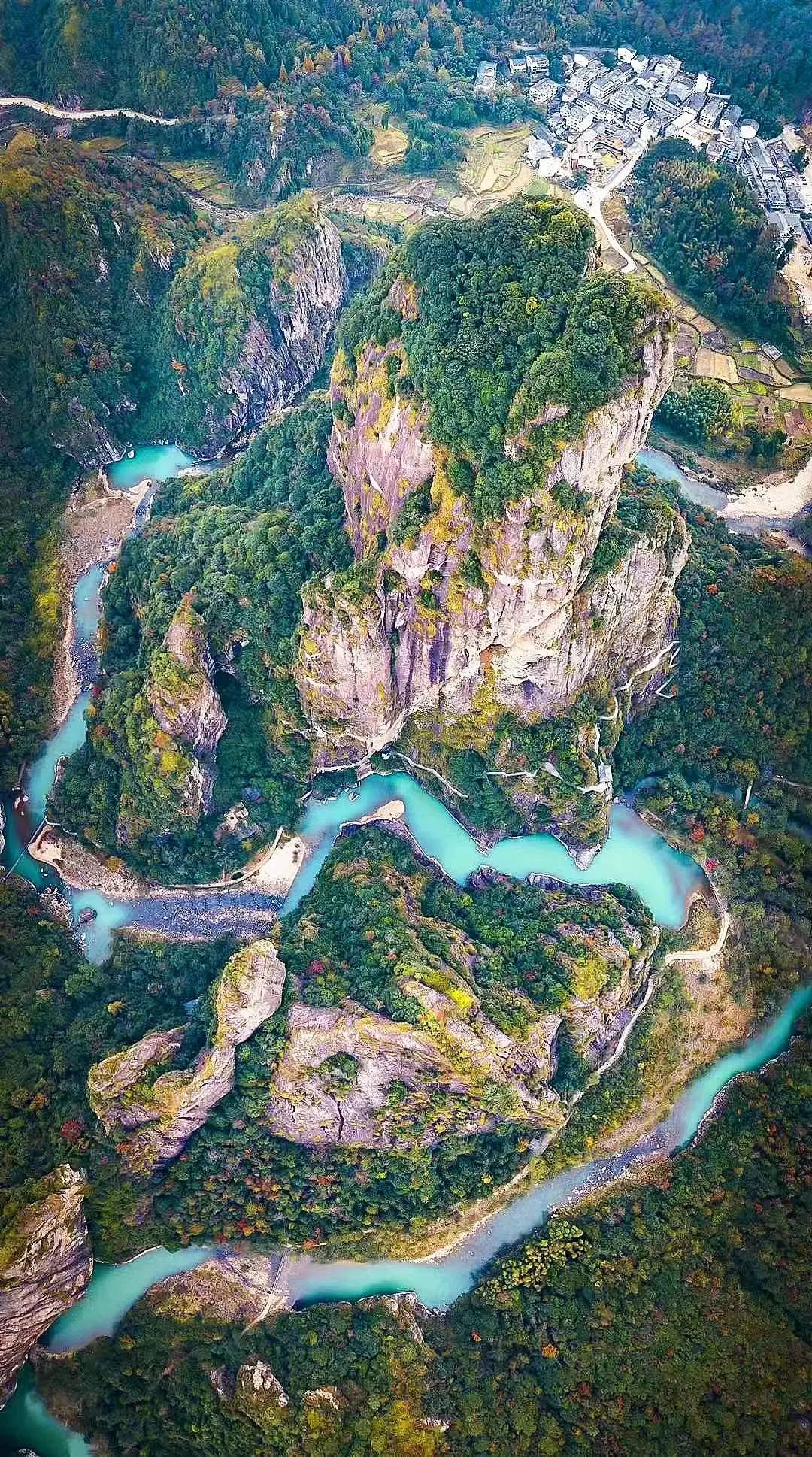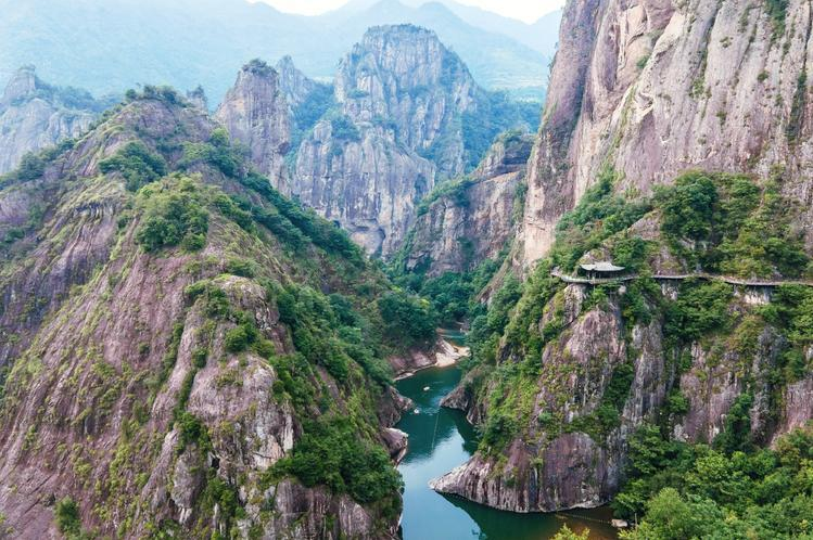 石桅岩三面环溪,纯净的水如绿宝石镶嵌的腰带,盘旋环绕,时窄时宽,时缓时急。泛舟听水,或是急流勇进,都能体会大自然的神奇力量。