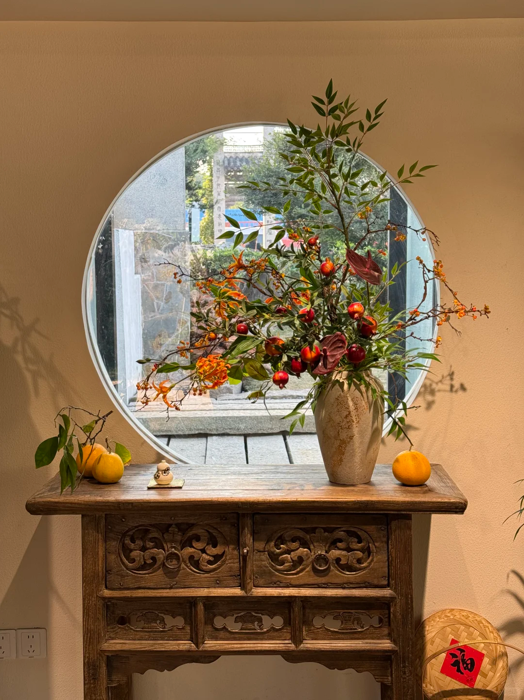 朱红山门上繁复的砖雕爬满缠枝纹,
