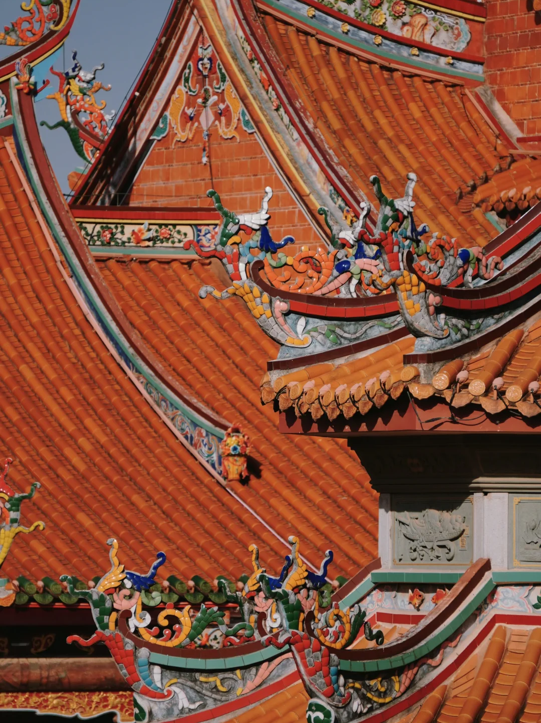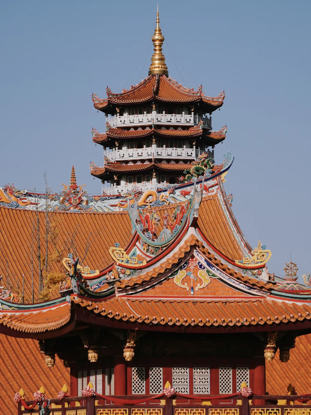 红墙燕尾脊搭配金色莲花砖,