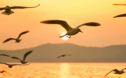 红嘴鸥在霞光中飞舞