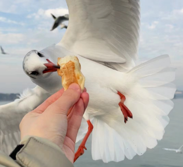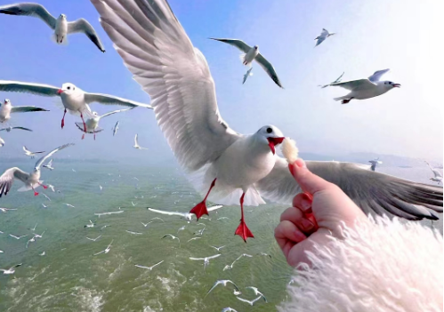 朝着空中的红嘴鸥投喂。