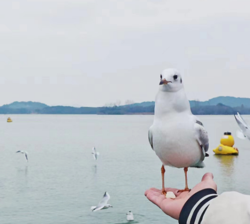 与红嘴鸥亲密互动的欢乐之中。