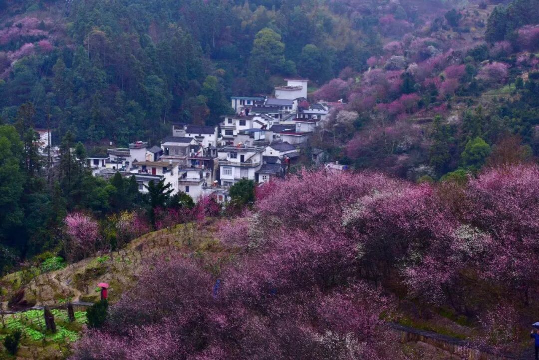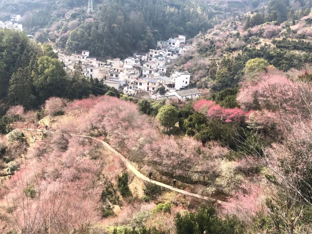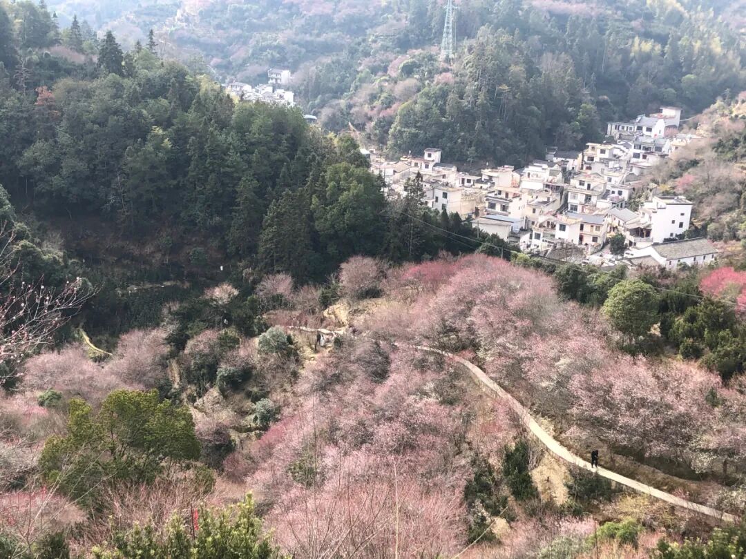 穿过古村落,踏上乡间小道,说不定老水牛在此“挡道收费”,拾级而上,徒步到山中,更是视野广阔,只见远处山中有一村落,白墙黑瓦,被粉色、红色的梅林所围绕,成了中国立体山水画,美不胜收。