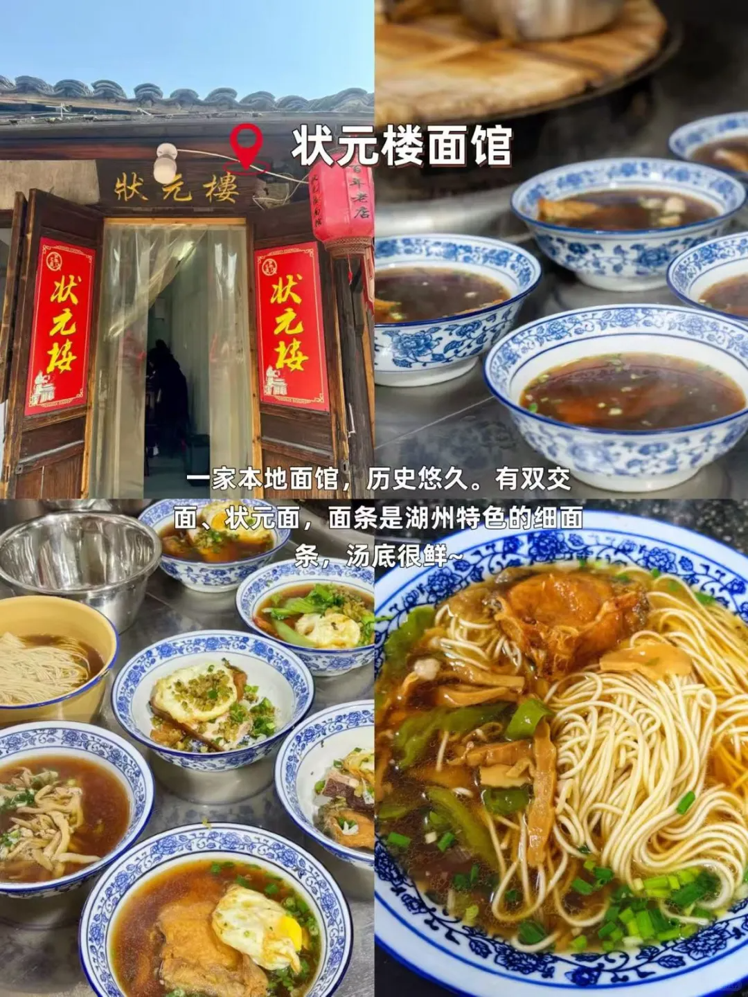 中午 前往【衣裳街】寻找美食,这里有着湖州传统美食,皮薄馅足的诸老大粽、鲜掉眉毛的周生记馄饨、香甜软糯的丁莲芳千张包、当地人超爱的状元面,还有秋冬才上市的羊肉面。