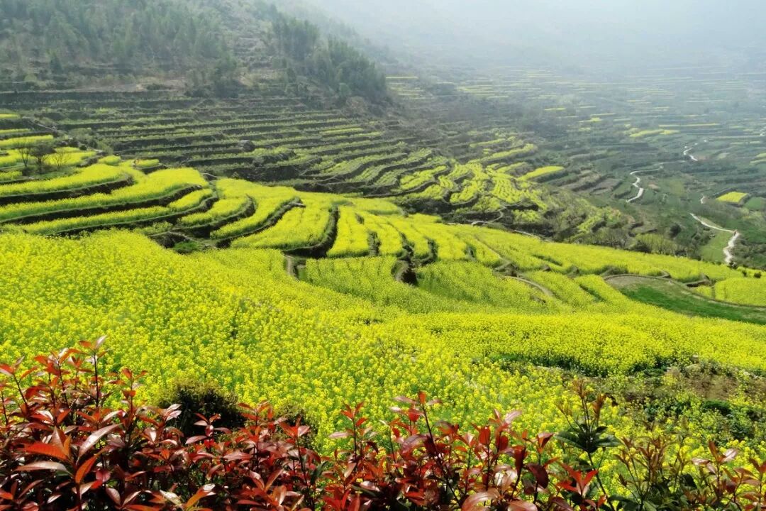 如果是在下雨天,油菜花在梯田上,犹如盘旋在云雾之中,如梦如幻。
