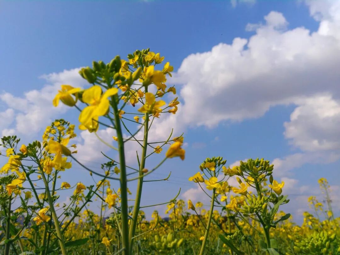 油菜花初开的时候,浅黄和嫩绿交织一起,清新灿烂。