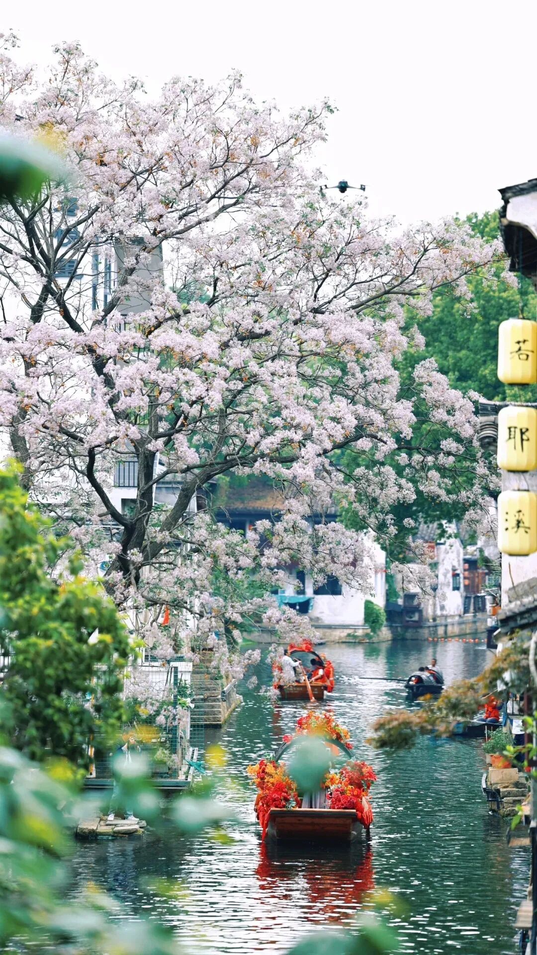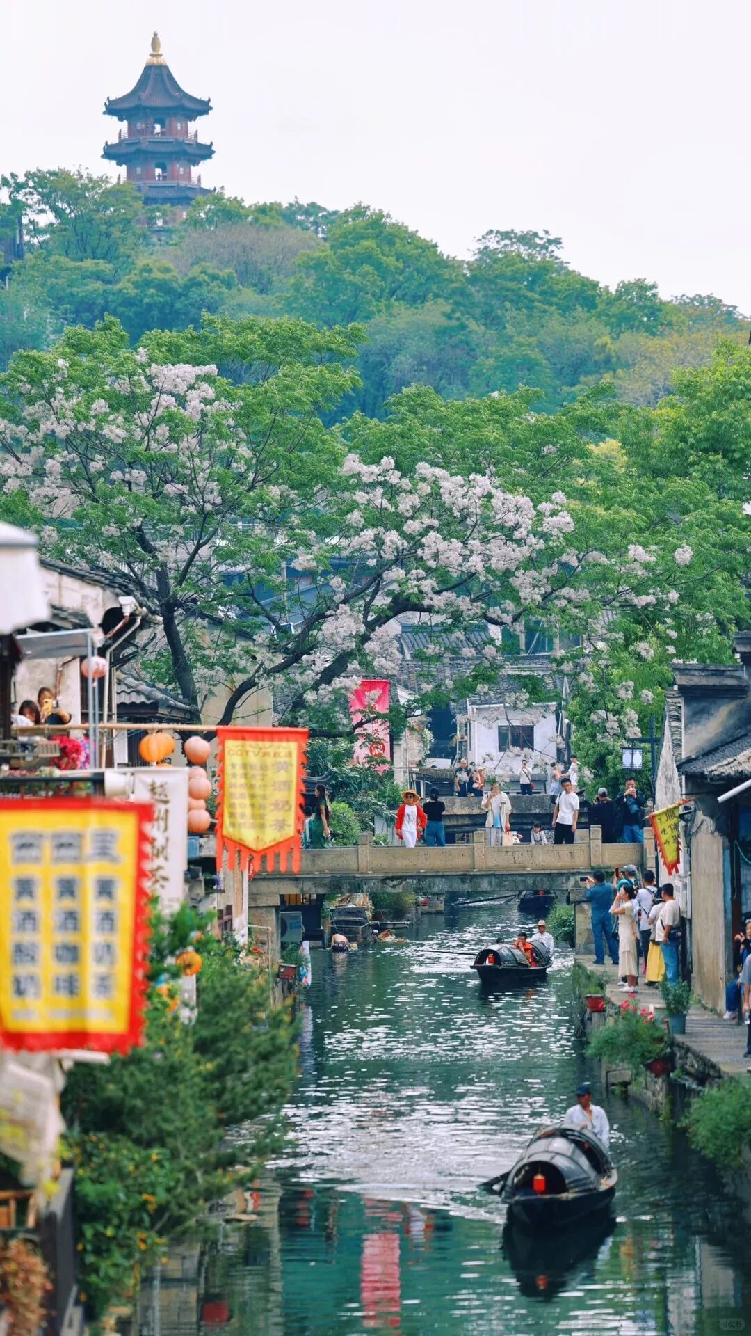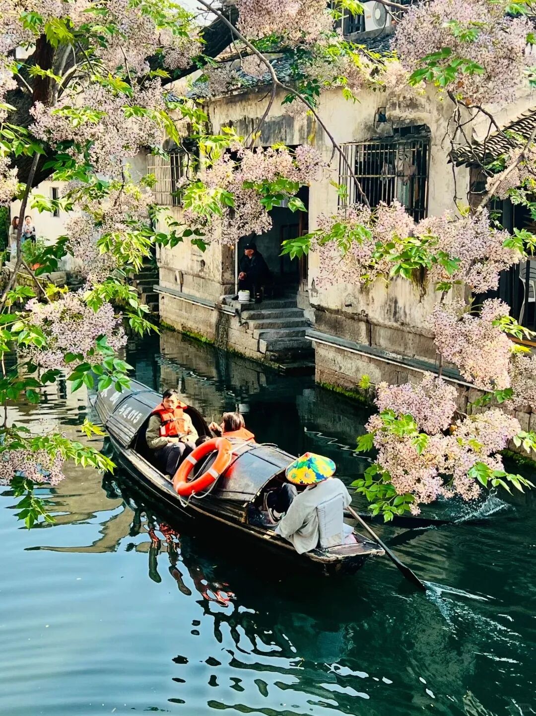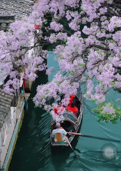 最佳拍照机位在仓桥直街的孔乙己酒家,或状元楼畔的那座小桥上,能拍到花随着风,很温柔地落在水里。或是静候片刻,待乌篷船悠悠划入画面,那便是将江南的温婉韵味尽数收纳,一张极具氛围感的大片便应运而生。