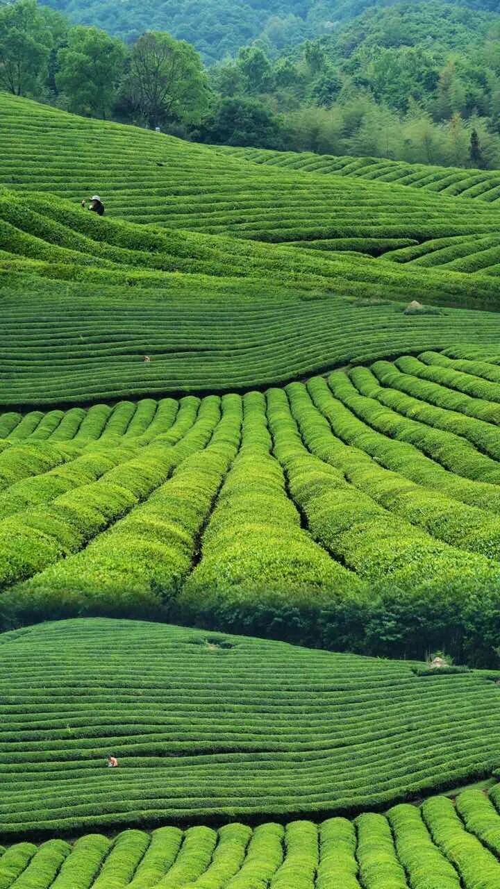 那一行行茶丛,犹如一条条翠绿的丝带,浓浓密密地伸展着。