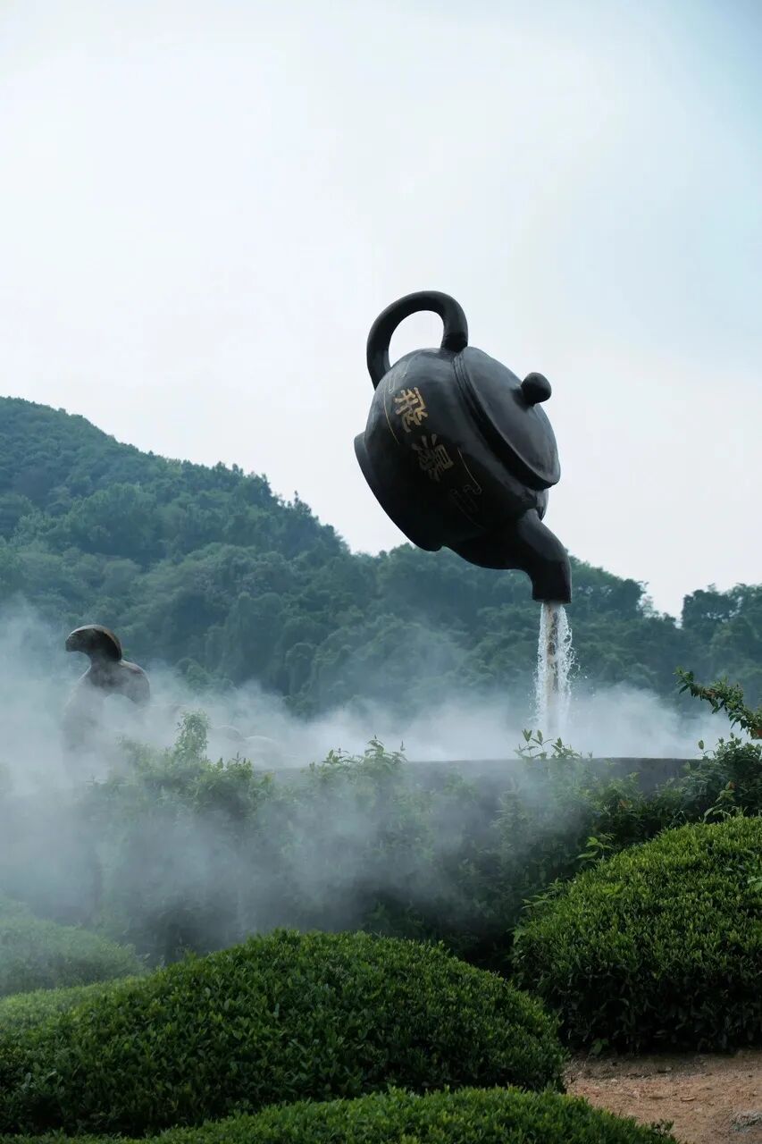 走上茶园观光台,极目远望,一把直径约两米的茶壶悬空倒挂,壶嘴喷射出一道水柱,无需过多修饰,怎么拍都是艺术大片。