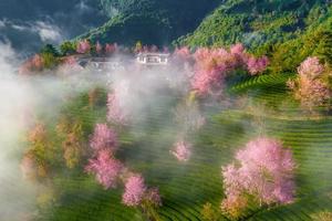 早起观看无量山樱花日出、云海、晨雾,有云雾缥缈和艳红的冬樱花在碧绿茶山上绽放光彩,这是云南的秋日浪漫!