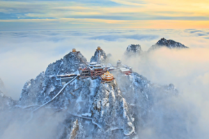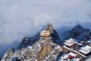 华灯初上之时,无数的雪花飘扬在金顶,整个金顶道观群,琼楼焕彩,灯火阑珊,有种穿越千年的梦幻感,美得惊心动魄,只一眼就让你心动。