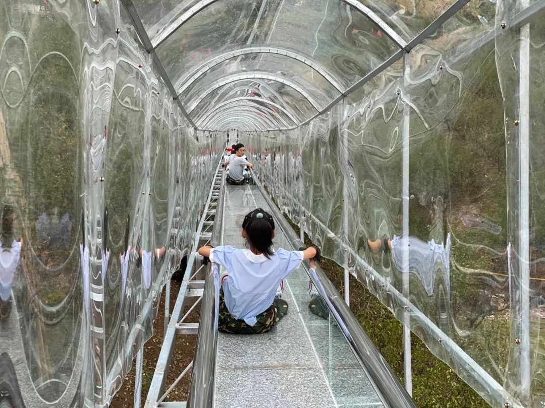 2小时后 我们抵达原乡小镇,这里是华东地区首个综合性户外探险公园。进入景区后可自由安排,可以先去游览瀛洲梅园,然后登上玻璃桥,体验一番高空赏花的独特经历。也可以直接先去玩小火车穿越。景区内有餐厅,可自带午餐也可以新春市集觅食。